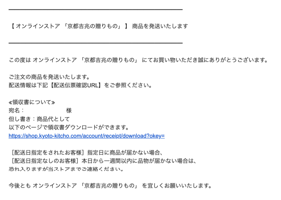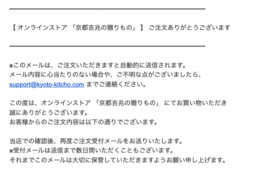 ご登録のメールアドレス宛てに、ご注文内容の確認メールをsupport@kyoto-kitcho.comよりお送りしますのでご確認ください。